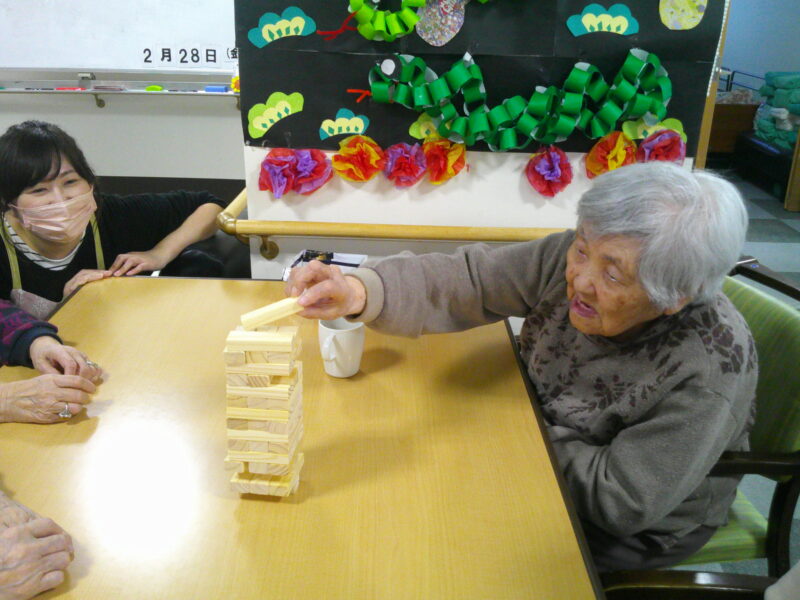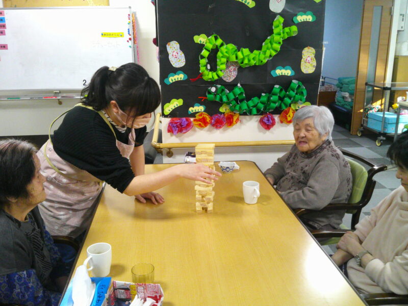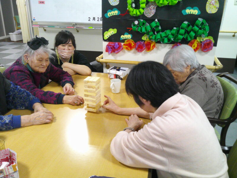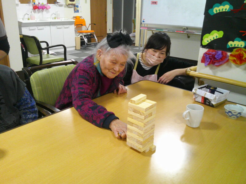 利用者様の世代にはあまり馴染みのないゲームなので、職員を交えてまずお試しです。