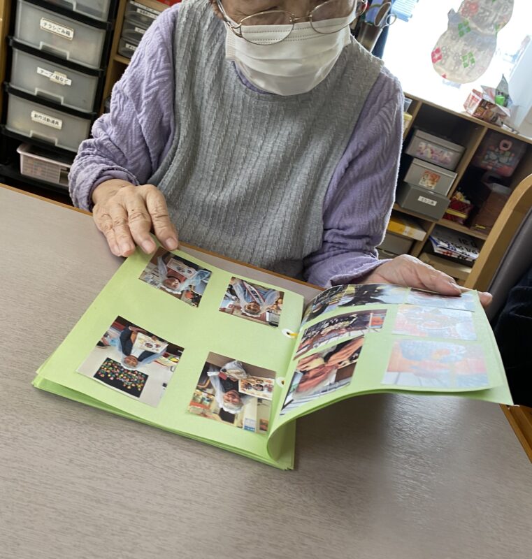 一年分の写真を前に、「わぁ!こんなこともあったね」と笑顔の利用者様。