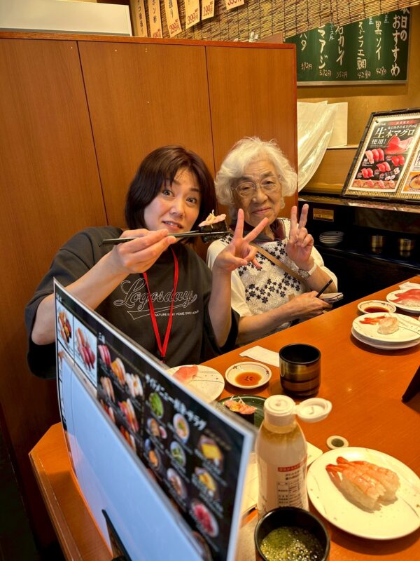 お寿司の日は、たくさんあるメニューに悩みながらも「高いものばかリ食べちゃった」と照れ笑いの利用者様。