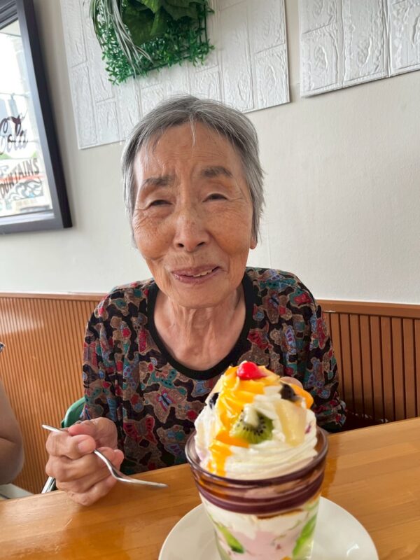 スイーツの日では、大きなパフェを前に目を丸くする利用者様。