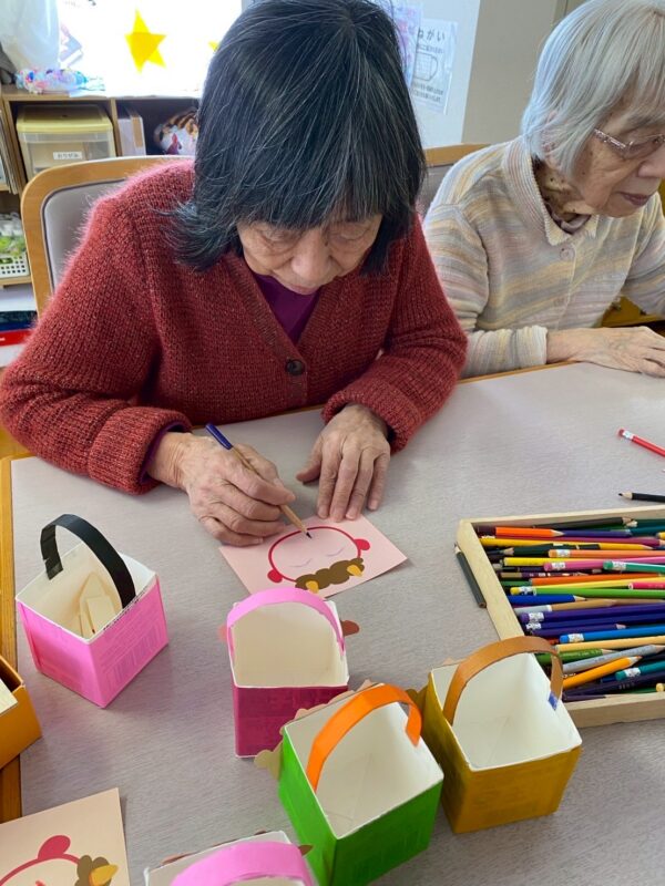 今年の豆を入れる箱は利用者様がそれぞれ鬼とオカメの顔を描きました。