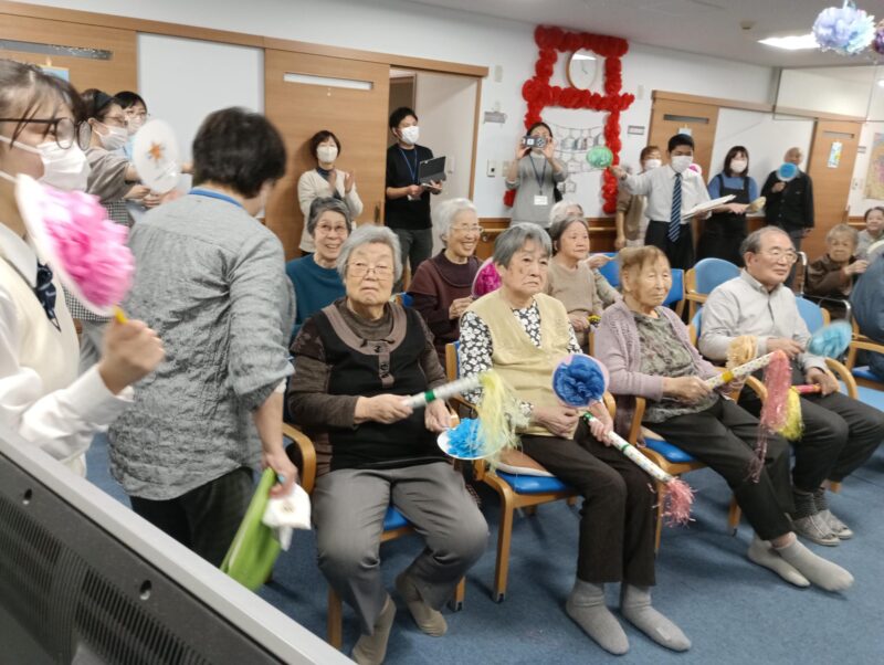 生徒さんとご利用者様、先生、職員が輪になっておしゃべりを楽しみ、笑顔の絶えないひとときとなりました。