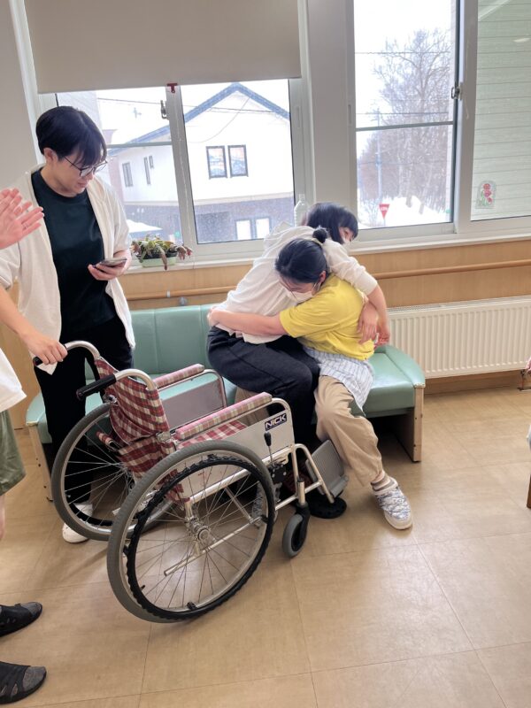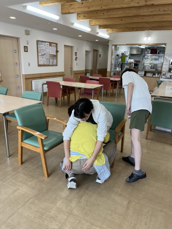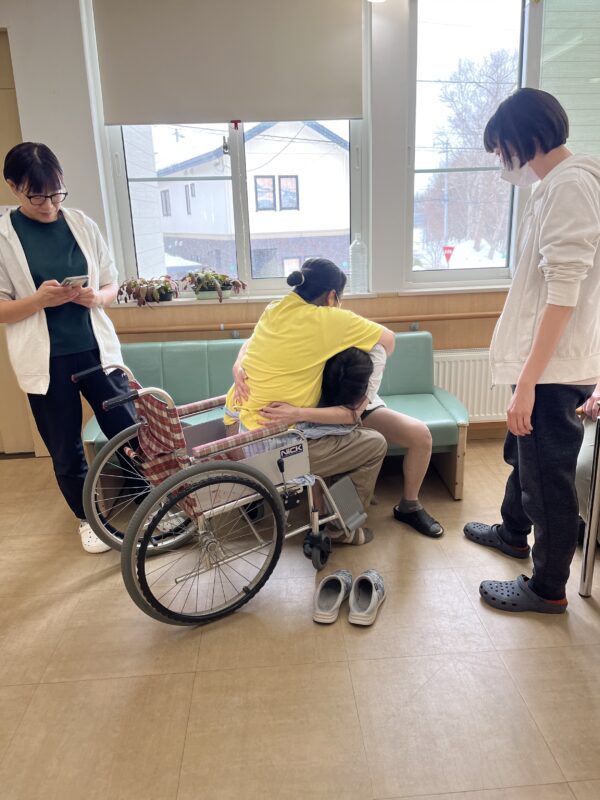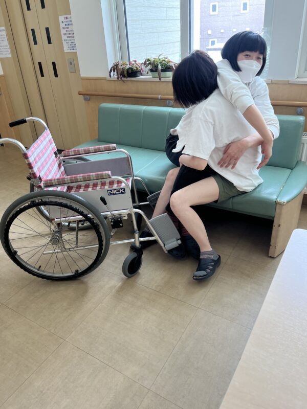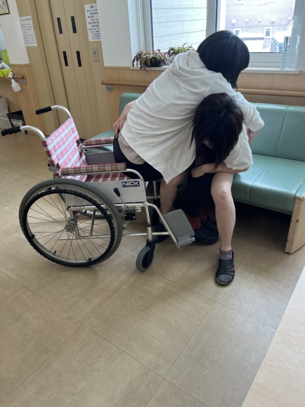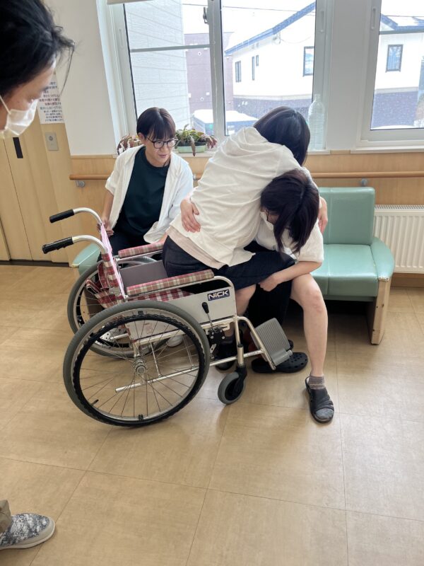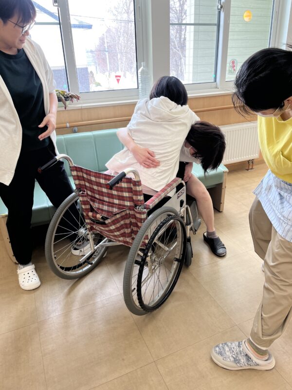 ヘルパーさん達で移乗の確認と新しい移乗方法にチャレンジすることにしました。
