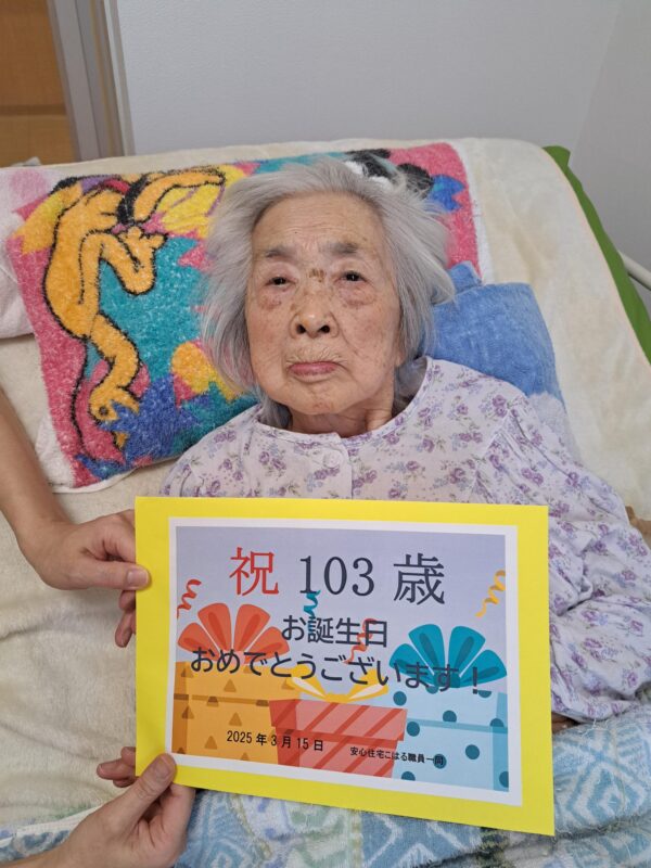 先日、当施設「安心住宅 こはる」にご入居されている老田春枝様が103歳のお誕生日を迎えられました。