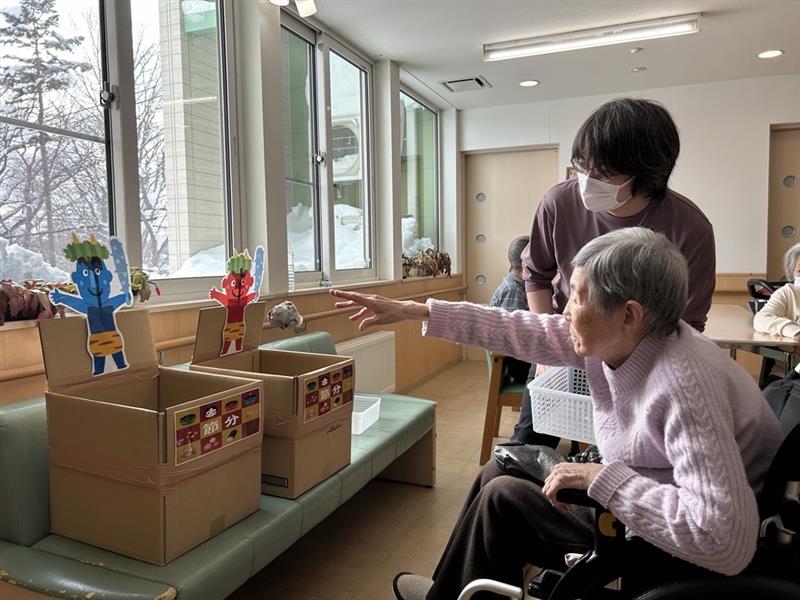 2月3日、安心住宅こはる(江別)では、節分の行事として豆まき風のレクリエーションを実施いたしました。