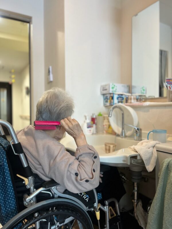 車いすに座りながら、K様がゆっくりとご自分の髪を