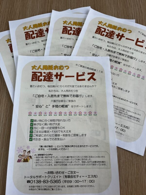 先日「大人用おむつ配達サービス」のご案内をさせていただきました。